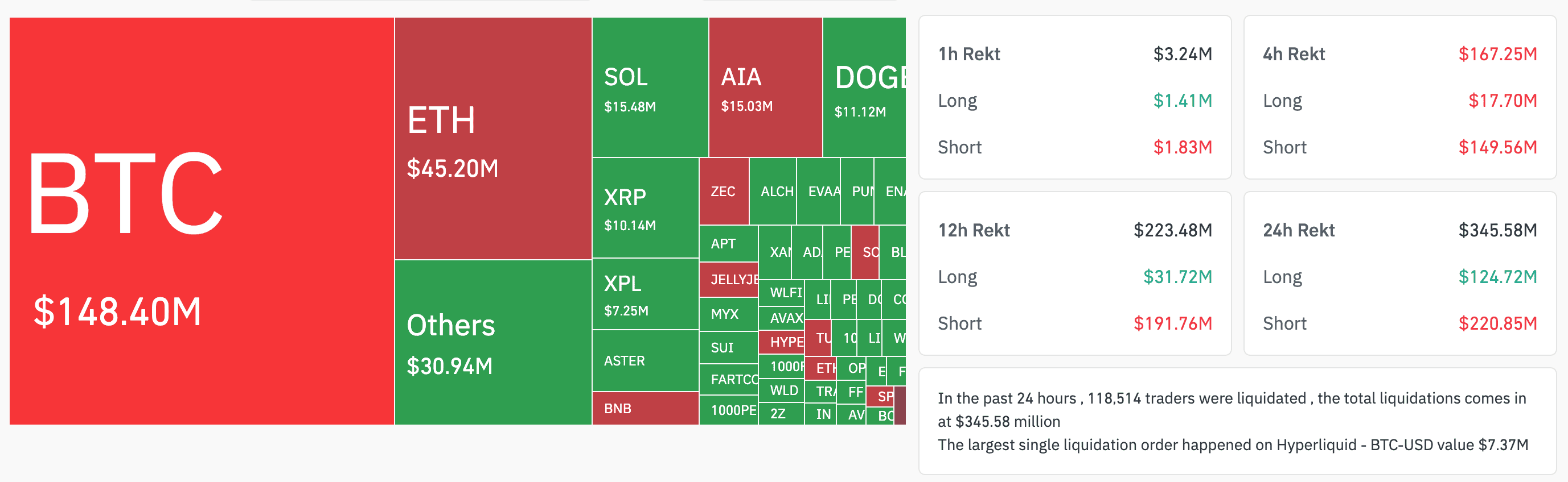 - Сумма ликвидаций на крипторынке составила $345,58 млн.