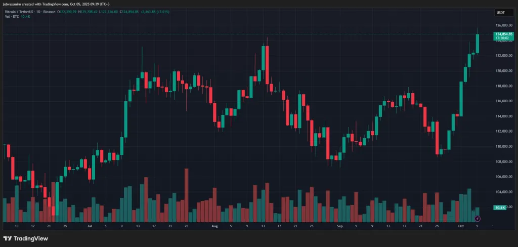 5 октября первая криптовалюта зафиксировала новый исторический максимум (ATH) на отметке $125 708.
