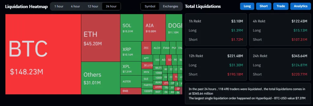 За прошедшие сутки объем ликвидаций достиг $345 млн — из них $220 млн пришелся на шорты.