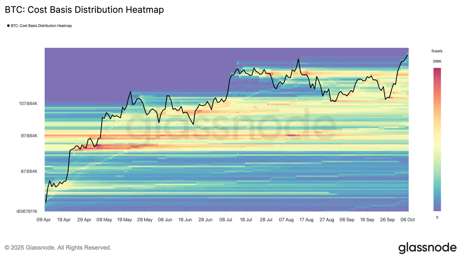 Glassnode использовал «тепловую карту распределения стоимости» для выявления структурной поддержки, отметив, что она ограничена отметкой от 121 000 до 120 000 долларов и усиливается вблизи 117 000 долларов, где в последний раз было приобретено около 190 000 BTC.