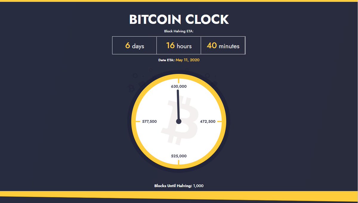 Пошел обратный отсчет до халвинга биткоина – до генерации блока 630000 осталось меньше 1 тыс. блоков. При текущих темпах создания блоков халвинг наступит 11-12 мая.