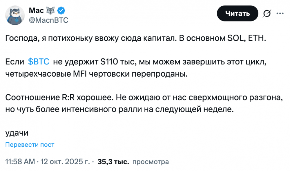 Криптовалютный аналитик Mac также предупредил, что биткоину необходимо удержаться на уровне $110 000, чтобы не сигнализировать об окончании текущего цикла. В публикации на X он отметил, что 4-часовой индекс денежного потока (MFI) «сильно перепродан», что указывает на возможность краткосрочного роста BTC.