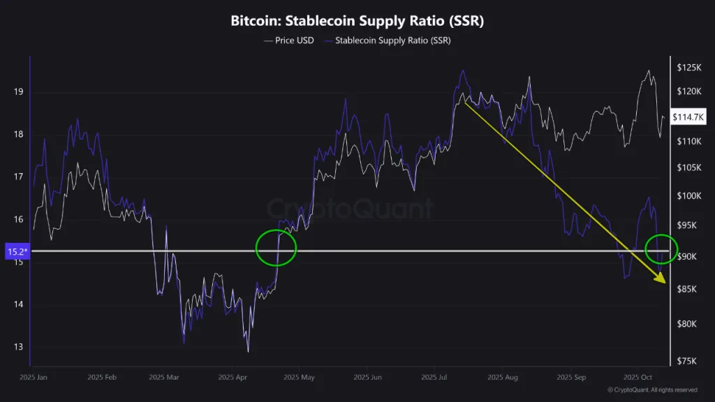 Однако особую роль играет соотношение предложения стейблкоинов к биткоину (SSR), отметил EgyHash. Значение сравнялось с апрельскими минимумами.