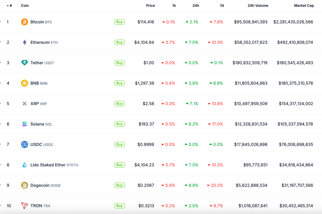 На момент написания первая криптовалюта торгуется около $114 500, подорожав на 2,1% за последние сутки. Ведущий альткоин восстановился до $4100.