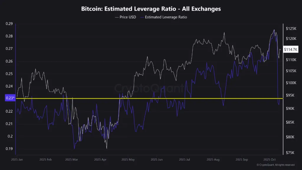 Показатель левериджа (ELR), измеряющий среднее плечо трейдеров относительно резервов на биржах, снизился до минимальных значений с 2022 года.