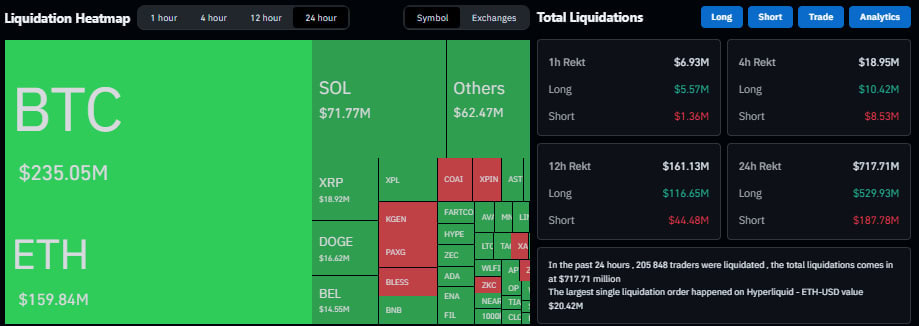 На фоне этого объем ликвидаций по фьючерсам на рынке криптовалют превысил отметку в $715 млн за 24 часа.