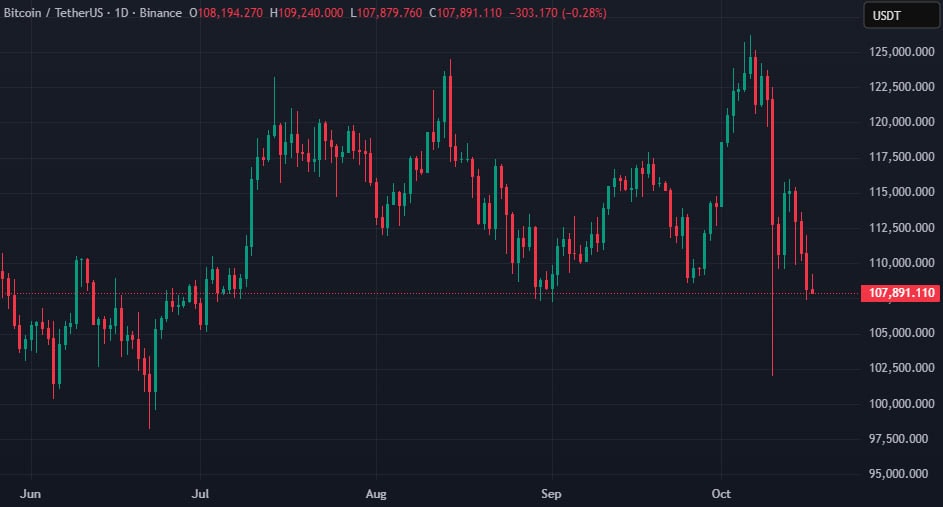 В ночь на 17 октября 2025 года курс биткоина упал ниже $107 500. Позже цена первой криптовалюты восстановилась до $108 000. На момент написания актив пытается закрепиться выше этой отметки:
