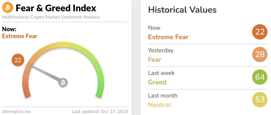 - Индекс страха и жадности упал до 22 пунктов.