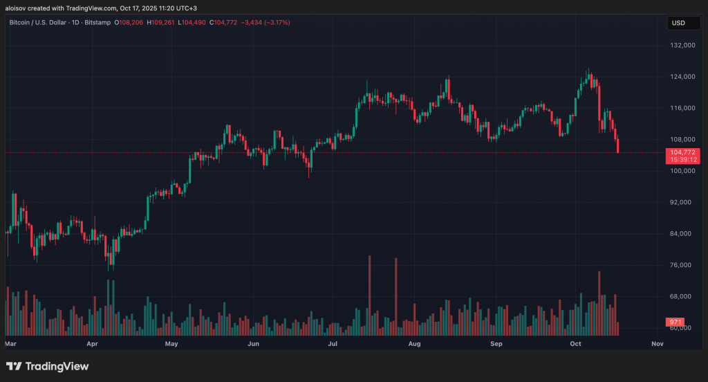 По данным CoinMarketCap, биткоин за последние 24 часа потерял 5,1% и торгуется на уровне $104 772. Крупнейшая криптовалюта опустилась ниже отметки $108 000 ранее сегодня — это минимальное значение с начала сентября.