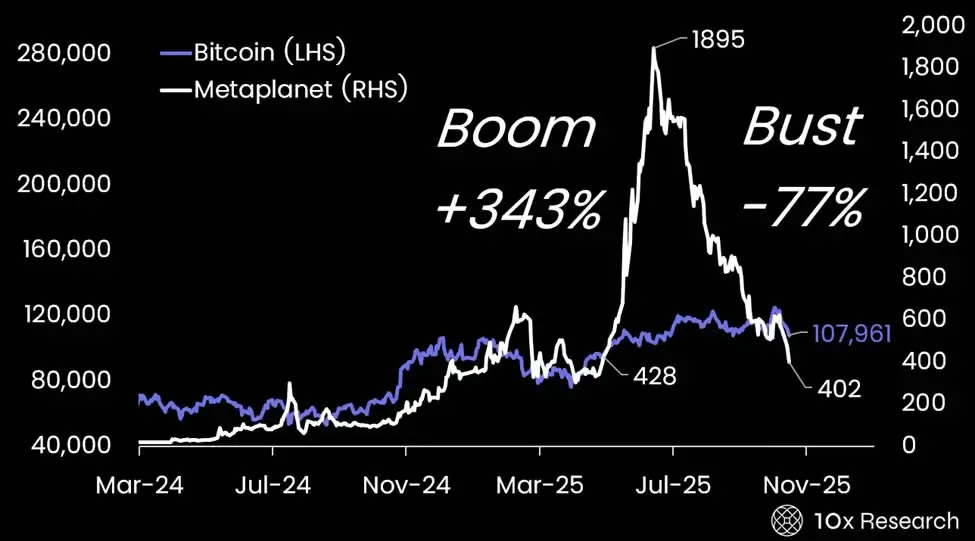 Взлет и падение акций Metaplanet. Источник: 10x Research.