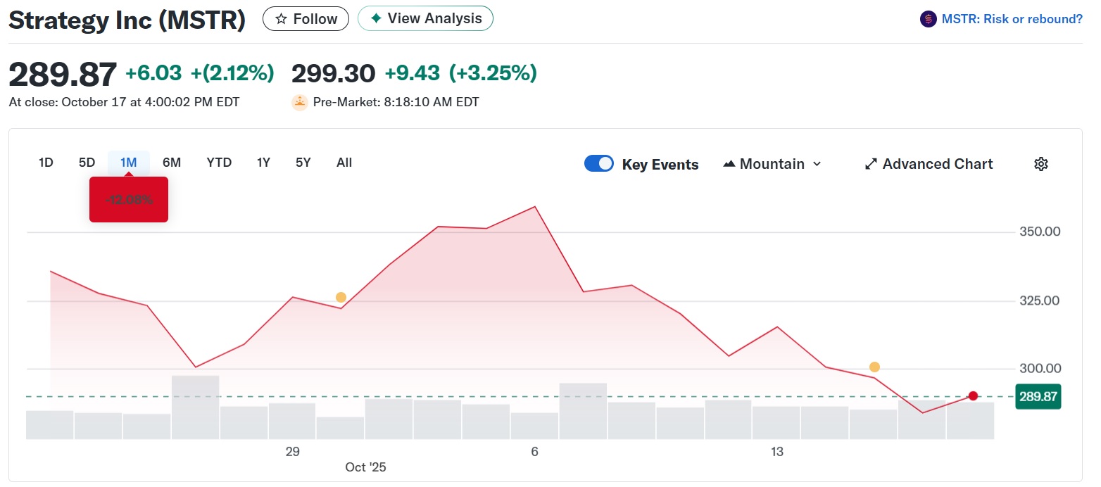По данным Yahoo Finance, на фоне падения рынка акции Strategy, торгующиеся под тикерами MSTR, STRC, STRK, STRF и STRD, снизились примерно на 12% за последний месяц.