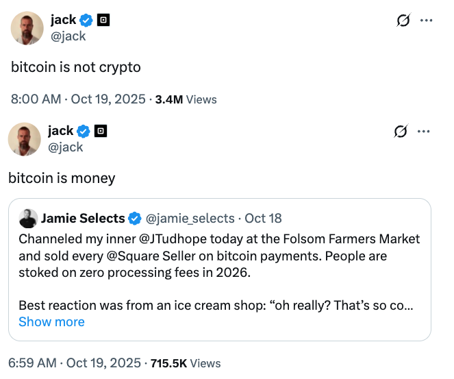 В воскресенье Дорси опубликовал в X короткое сообщение: «Биткоин — это не криптовалюта», которое вызвало широкий резонанс и собрало более 4000 комментариев.
