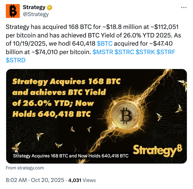 Последнее приобретение биткоинов совершили по средней цене $112 051, хотя, согласно данным Coinbase, в пятницу на фоне потрясений от обвала рынка 10 октября курс биткоина падал ниже $104 000.