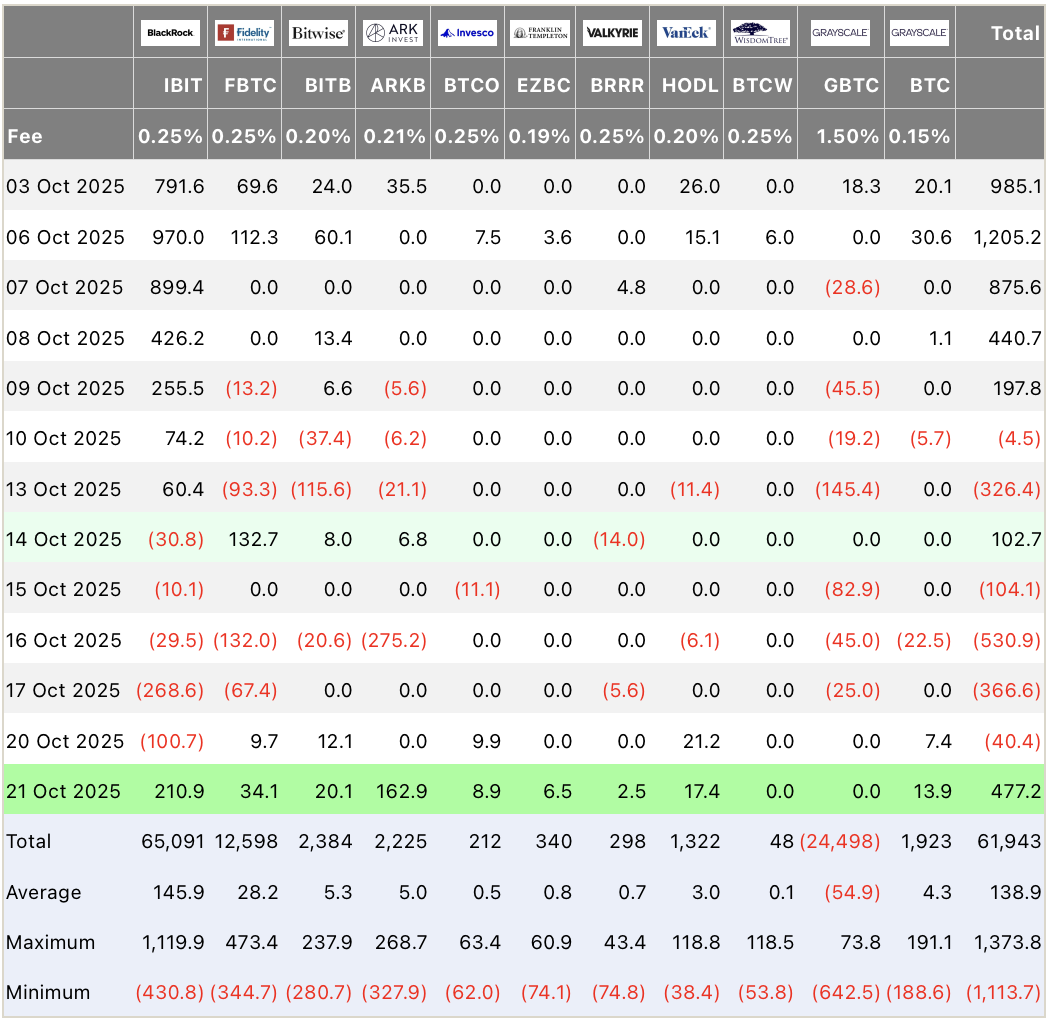 Американские спотовые биткоин-биржевые торговые фонды вернулись на позитивную территорию 21 октября, зафиксировав дневной приток $477,2 млн. Такой поворот событий наверняка порадует инвесторов после череды оттоков прошлых дней.