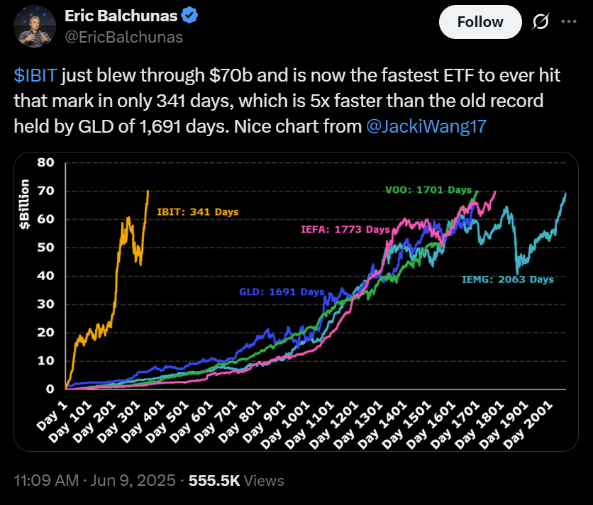 Согласно данным Bitbo, фонд IBIT от BlackRock оказался самым успешным среди примерно дюжины одобренных в США спотовых биткоин-ETF. В июне IBIT стал самым быстрым ETF в истории, преодолевшим отметку в 70 000 000 000 долларов по активам под управлением. С тех пор этот показатель вырос более чем до 88 000 000 000 долларов.