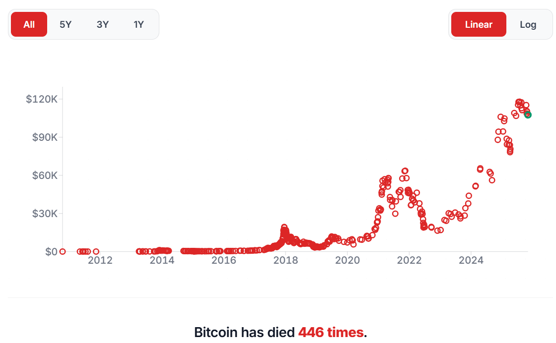 Биткоин снова «умер». По данным сайта bitcoindeaths.net, на 3 ноября 2025 года зафиксировано уже 446 объявлений о «смерти» первой криптовалюты. Каждый раз ее хоронили аналитики, банкиры или журналисты, предсказывавшие конец цифровых денег