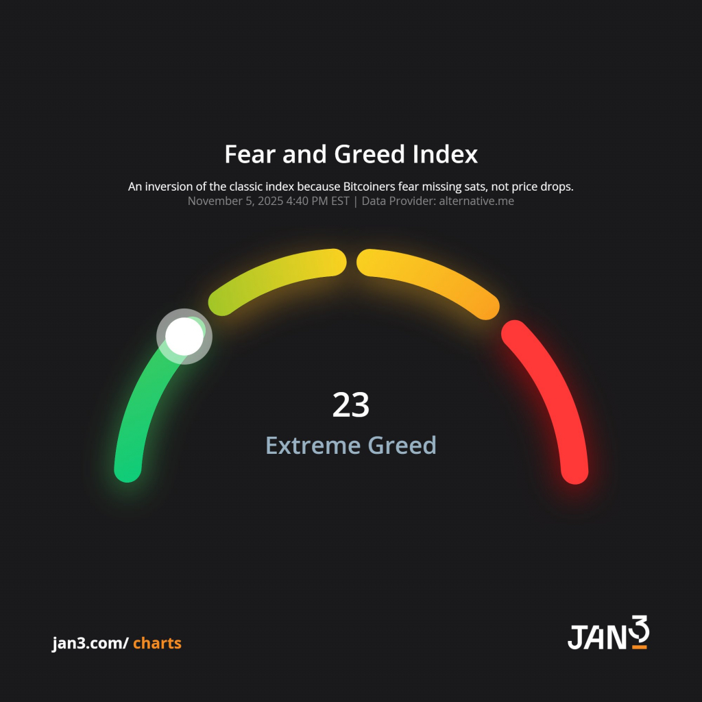 «Рынок плачет. Биткоинеры? Все еще накапливают. Индекс страха и жадности находится на отметке 23, что является зоной крайней жадности. Потому что биткоинеры переживают из-за упущенной возможности накопить сатоши, а не из-за снижения курса биткоина», — заявили в компании 5 ноября.