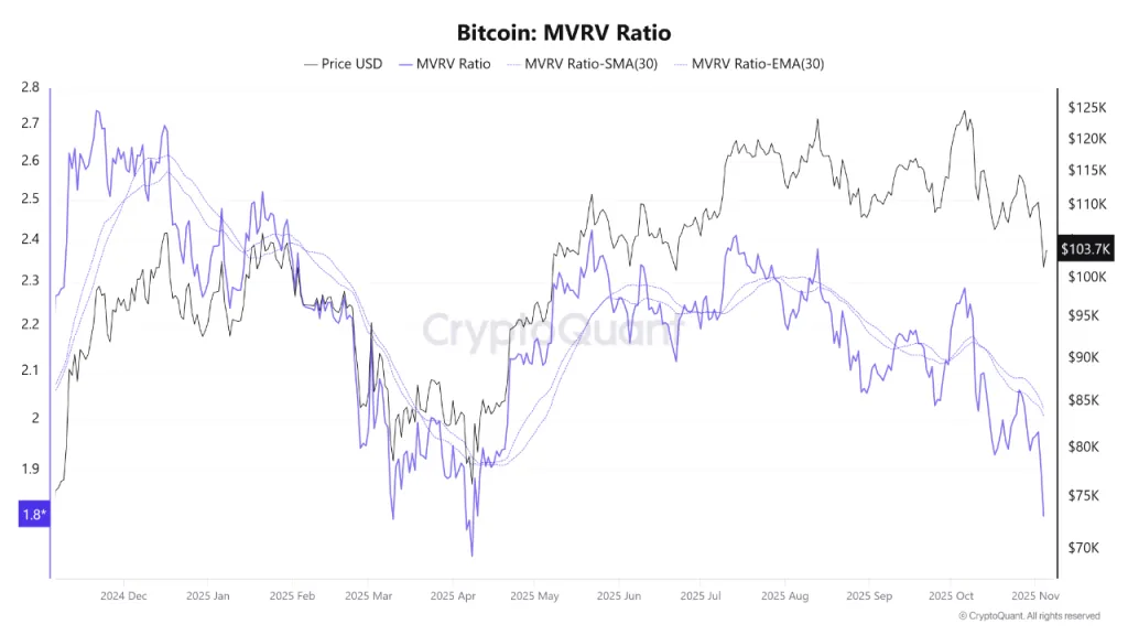 Фундаментальные показатели биткоина остаются устойчивыми, несмотря на панику. Ключевой сигнал подает коэффициент MVRV, который находится на самом низком с апреля значении (1,8), указали контрибьюторы CryptoQuant из XWIN Research.