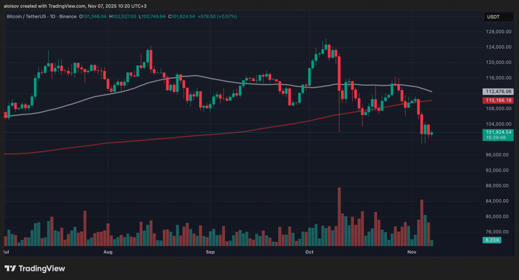 Биткоин опустился до $100 300 6 ноября, потеряв 2,5% за день вместе с американскими акциями на фоне неутешительных макроэкономических данных. Ведущая криптовалюта торгуется около $101 924, последовав за индексами S&P 500 и Nasdaq 100, которые также снизились.