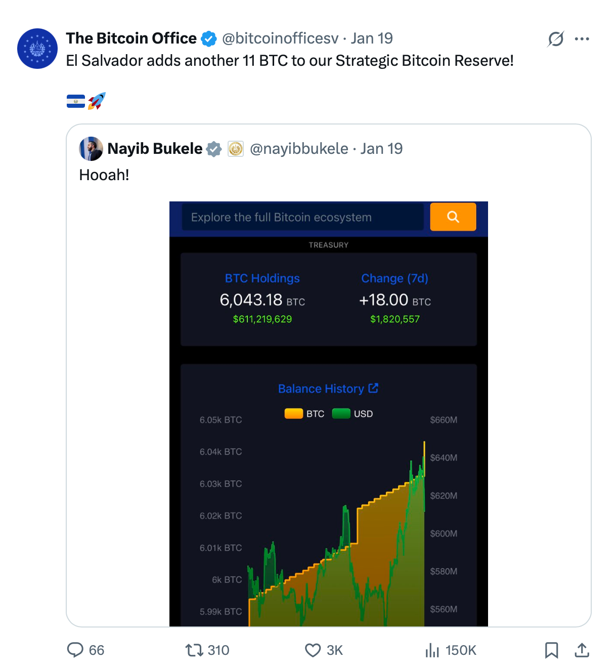 Несмотря на это, на сайте Биткоин-офиса Сальвадора продолжают отображаться записи о регулярных покупках биткоина правительством. На данный момент запасы составляют 6 374 BTC, что оценивается примерно в $654,8 млн.