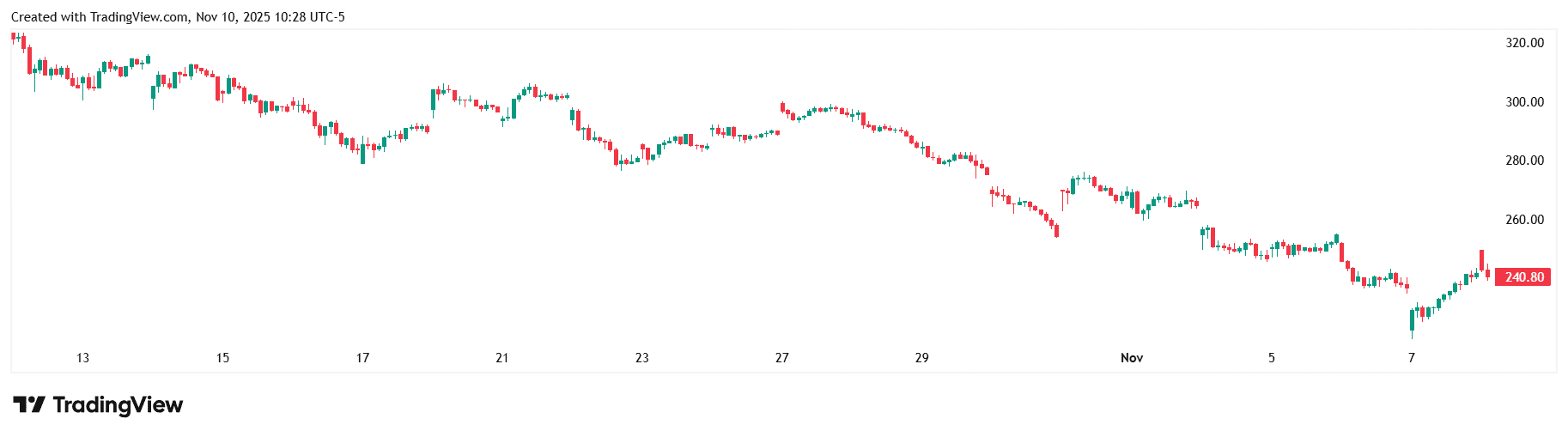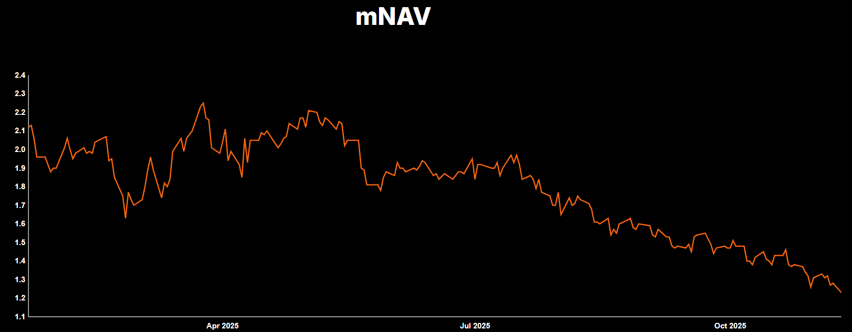 Показатель mNAV (Market Net Asset Value), который отражает разницу в соотношении капитализации компании к стоимости ее биткоин-портфеля, по состоянию на 10 ноября опустился до 1,25. Это все еще зона премии, но значение находится близко к пороговому: