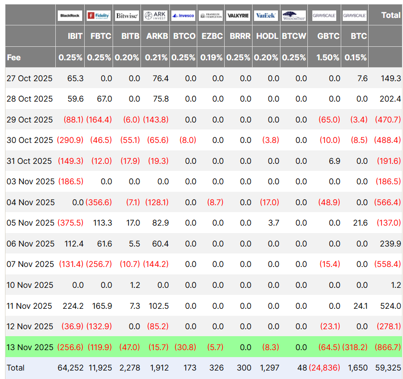 13 ноября спрос на инвестиционные фонды, связанные с биткоином (BTC) и другими криптовалютами, продолжил снижаться. По итогам торговой сессии инструменты потеряли около $866 млн.