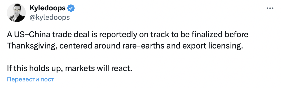 «Сообщается, что торговая сделка между США и Китаем будет финализирована до Дня благодарения. Она сосредоточена на лицензировании экспорта и редкоземельных металлах. Если это подтвердится, рынки отреагируют», – отметил аналитик Кайл Дупс.