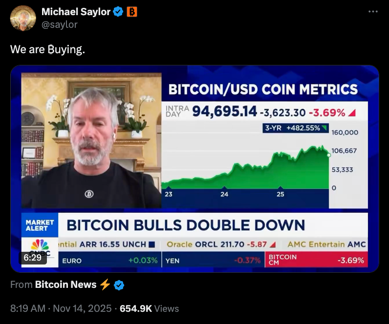 В пятницу в сообщении на X Сэйлор заявил, что утверждение, будто Strategy сократила свои общие запасы биткоинов примерно на 47 000 BTC, или 4 600 000 000 долларов на момент публикации, являются «неправдой». Сэйлор сказал, что компания продолжает покупать биткоины, поскольку цена упала более чем на 4% менее чем за 24 часа, с более чем 100 000 до менее 95 000 долларов США.