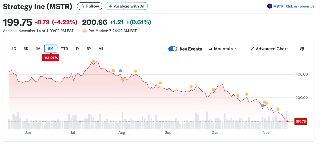 Инвесторы считают, что для казначейской компании устойчивым уровнем mNAV является 2 или выше. С июля акции Strategy подешевели более чем на 50% и на момент написания торгуются примерно по $199.