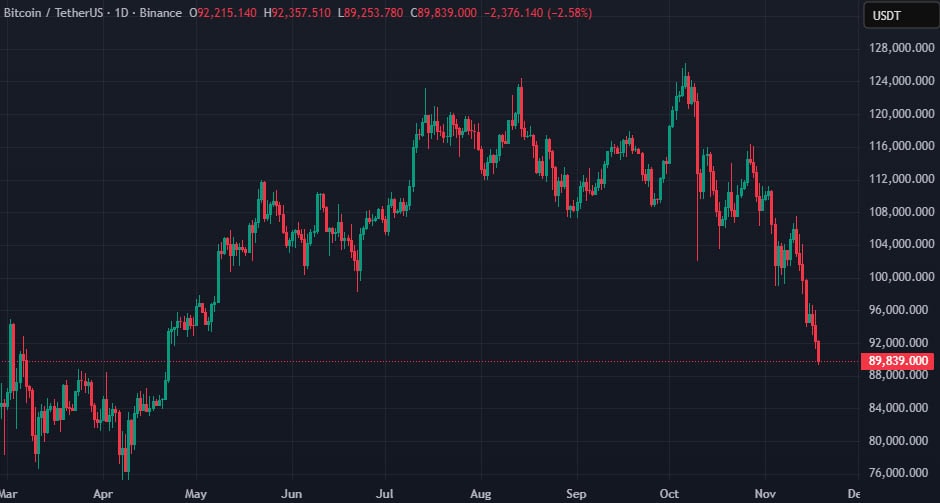 18 ноября 2025 года цена биткоина опускалась до уровня около $89 200, после чего немного восстановилась до примерно $89 700. Последний раз на таких уровнях первая криптовалюта торговалась около восьми месяцев назад — в апреле.