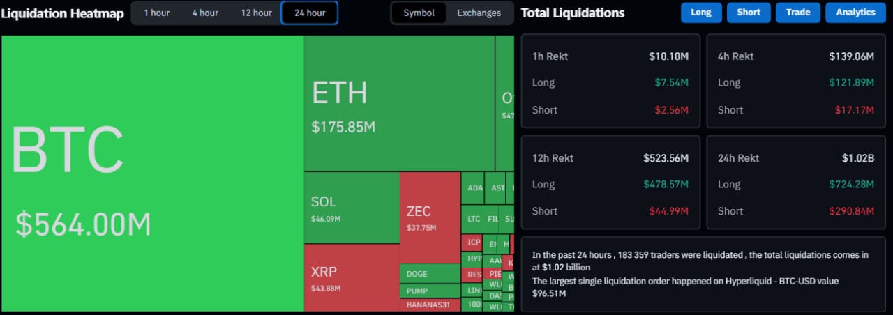 На фоне снижения цен наблюдался резкий рост объемов ликвидаций на криптовалютном фьючерсном рынке. По данным CoinGlass, общий объем принудительных закрытий позиций за 24 часа превысил $1 млрд. Ликвидации затронули более 183 000 трейдеров, причем большинство из них потеряли средства из-за лонг-позиций. В частности: