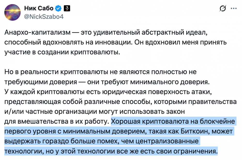 В публикации на платформе X в воскресенье Сабо пояснил, что каждая криптовалюта и сеть первого уровня имеет «правовую поверхность атаки». Это создает возможности для воздействия со стороны государственных регуляторов.
