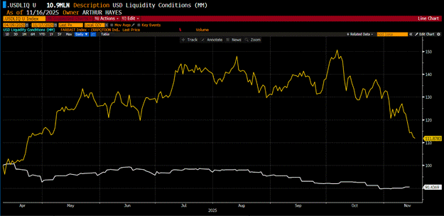 В новом эссе эксперт объяснил падение биткоина (BTC) со $125 000 до $90 000 на фоне умеренной слабости индексов S&P 500 и Nasdaq 100 вблизи исторических максимумов формированием кредитного кризиса. Он сослался на снижение индекса долларовой ликвидности с июля на $1 трлн.