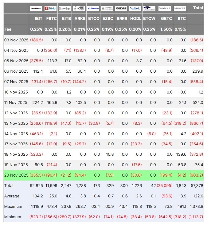 Американские спотовые биржевые фонды (ETF) на базе первой криптовалюты пережили очередной разворот 20 ноября. За сутки из BTC-ETF вывели $903 млн, что стало новым антирекордом ноября, согласно Farside Investors.