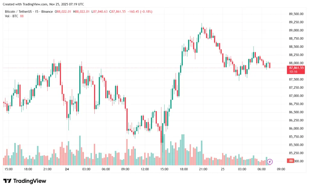 На момент написания биткоин торгуется по ~$87 800, прибавив за сутки 1,1%.