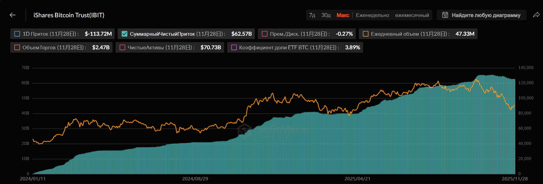 Американский спотовый ETF на базе биткоина (BTC) под тикером IBIT запустили в январе 2024 года. В ноябре он установил исторический рекорд: за 341 день в него вложили $70 млрд. По данным SoSoValue, текущий объем чистых активов фонда составляет $70,7 млрд.