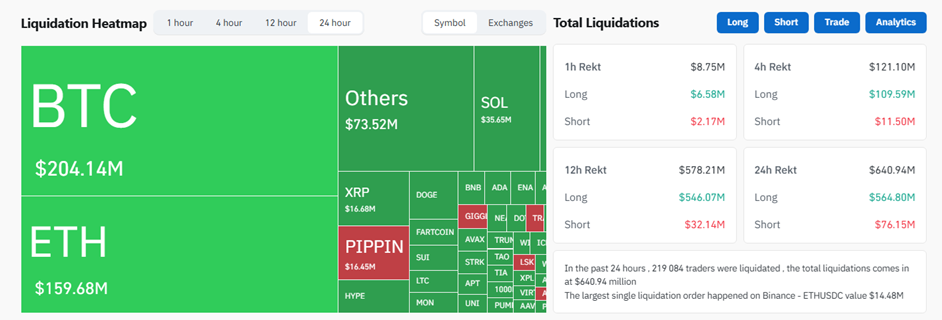 Объем принудительно закрытых лонгов за последние 24 часа составил $564,7 млн, из них $204,1 млн пришлись на биткоин.