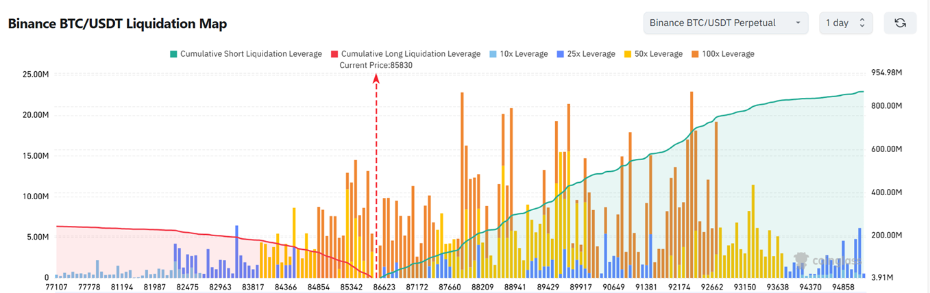 По данным Coinglass, если котировки не удержатся выше $85 000, ликвидации могут подвергнуться лонги в размере $315 млн. Подобная участь ждет держателей шортов при условии пробоя вверх $87 000. Объем принудительно закрытых позиций в этом случае составит $142 млн.