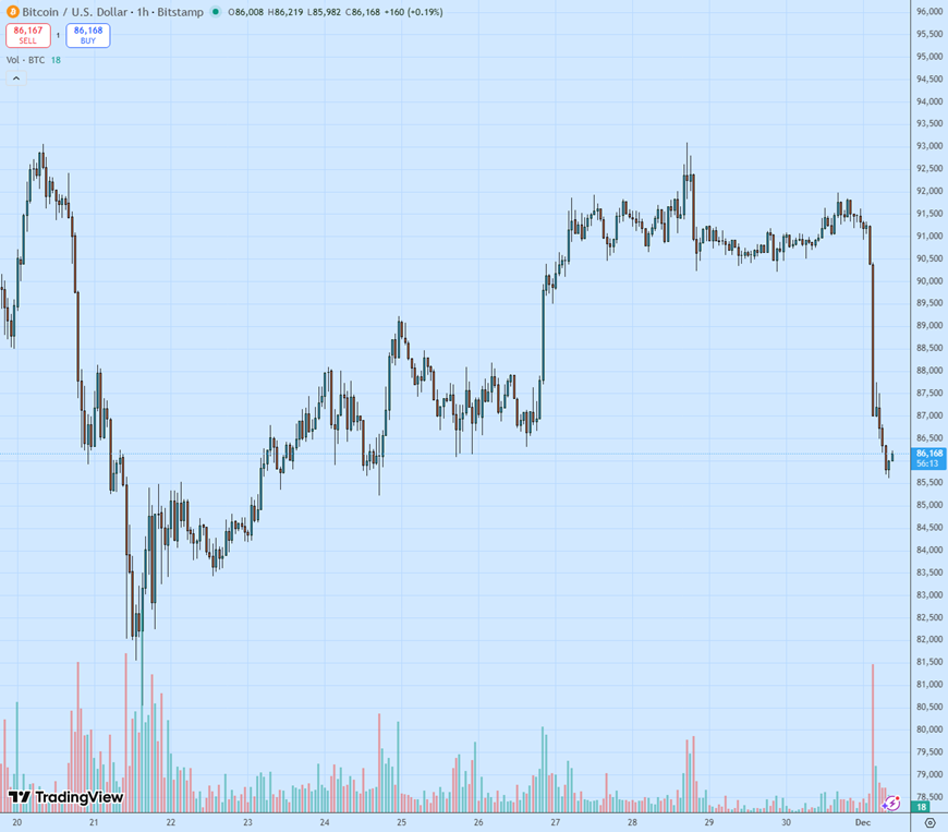 В понедельник утром 1 ноября курс биткоина (BTC) в моменте провалился к $85 600 на фоне ухудшения конъюнктуры на мировых финансовых рынках и волне ликвидаций длинных позиций. На момент написания монета торгуется по $86 170, согласно CoinGecko.