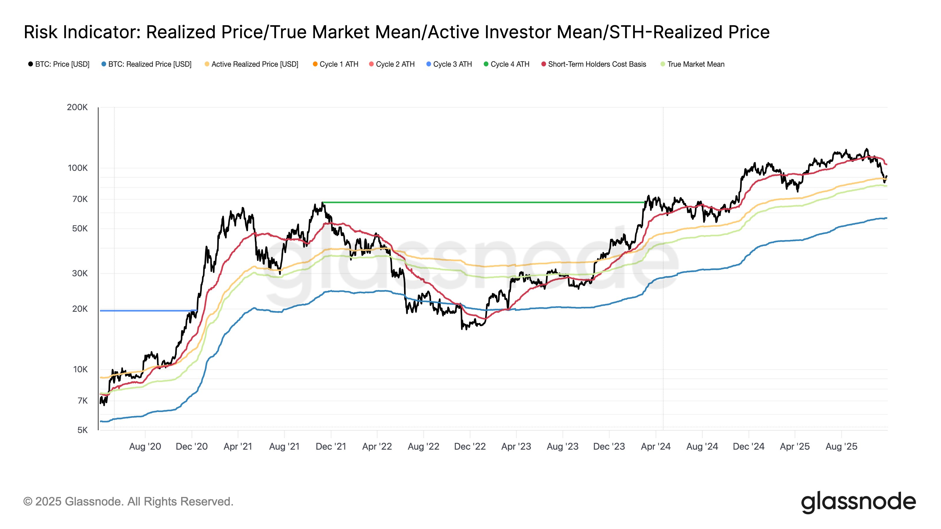 Текущая цена ушла ниже стоимости покупок активных инвесторов ($88 100). Ниже — на $81 700 — располагается индикатор True Market Mean.
