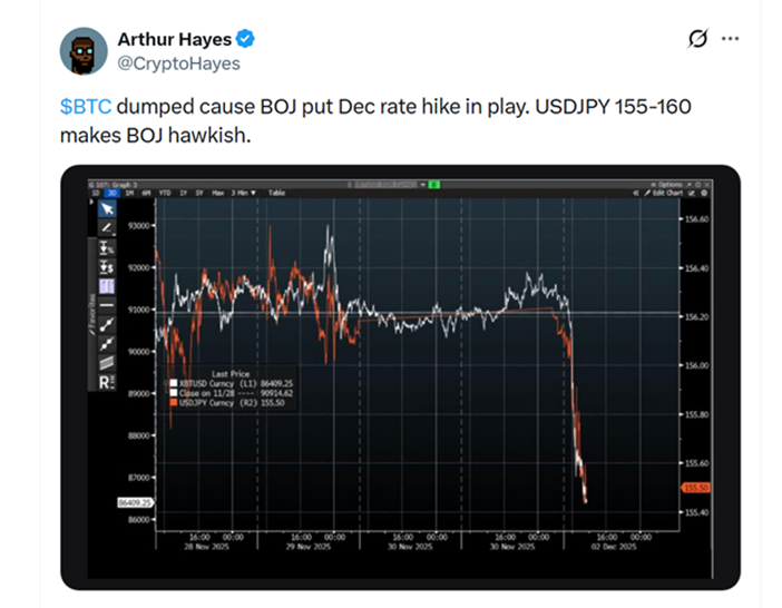 Основатель BitMEX Артур Хэйес связал падение биткоина с ростом ожиданий подъема ставки Банком Японии в декабре.