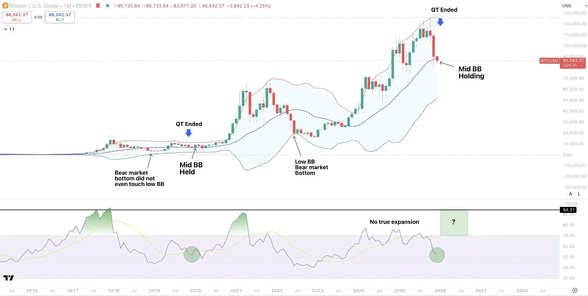 По словам аналитика, цены на биткоин никогда не опускались ниже полос Боллинджера на месячном таймфрейме.