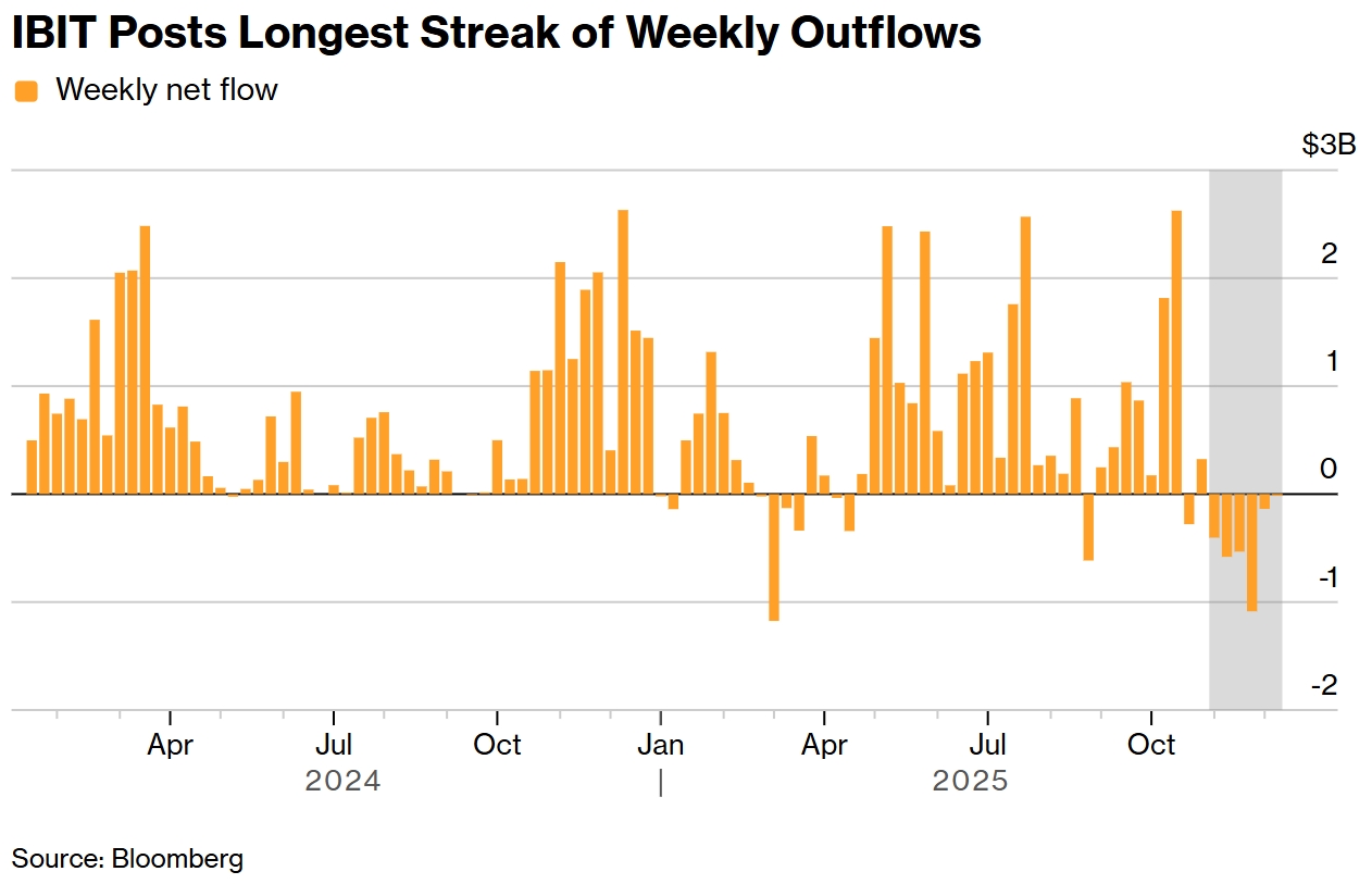 Cпотовый биржевой фонд (ETF) на биткоин IBIT от компании BlackRock зафиксировал самую продолжительную серию еженедельных выводов средств с момента своего дебюта в январе 2024 года, пишет Bloomberg. За предыдущие 5 недель из IBIT вывели $2,7 млрд, и текущая незавершенная неделя тоже в минусе на $16,5 млн.