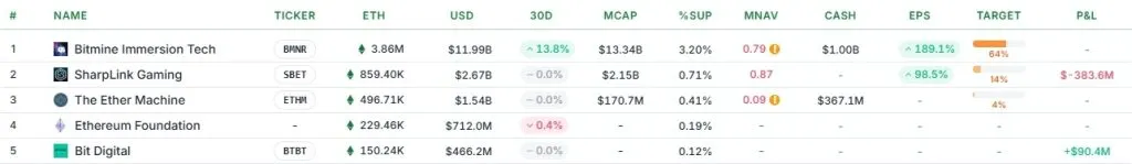 Согласно StrategicEthReserve, BitMine аккумулировала 3,86 млн ETH (3,2% рыночного предложения) текущей стоимостью $11,99 млрд. Но mNAV компании уже опустился до отметки 0,79.