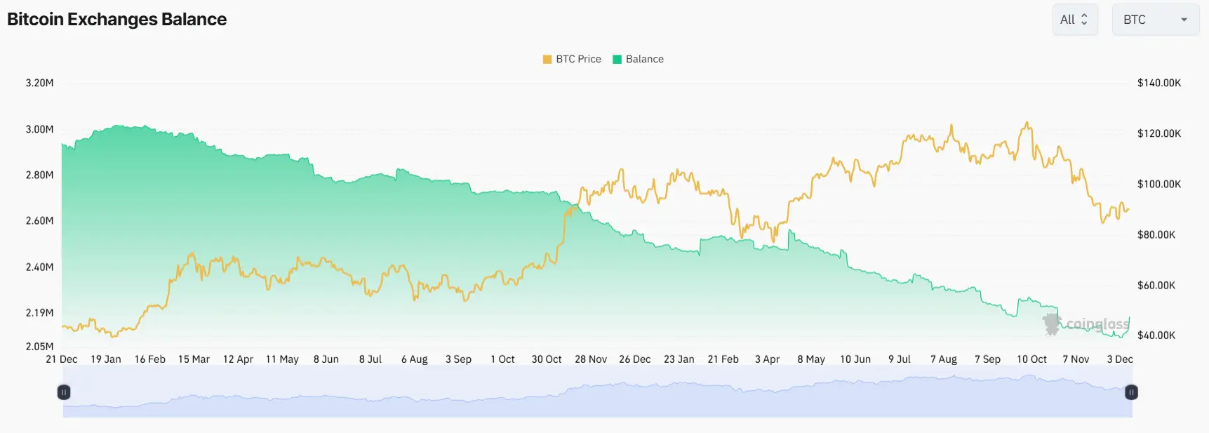 Аналитическая платформа CoinGlass фиксирует ту же тенденцию: по ее данным, на 22 ноября объем биткоинов на биржах составлял около 2,11 млн. В этот период биткоин переживал коррекцию и торговался по цене около $84 600.