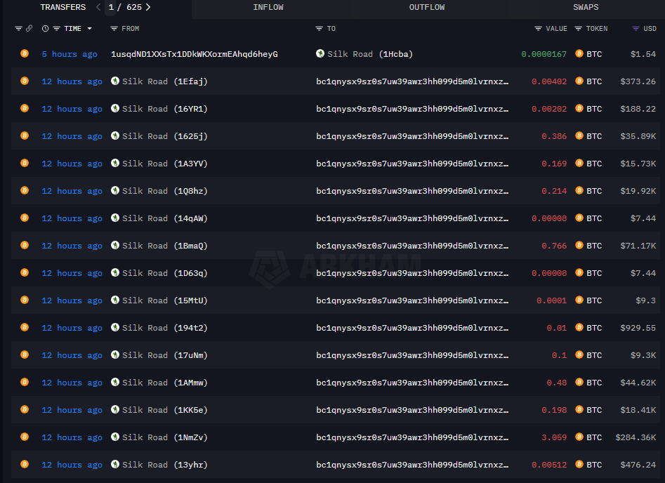 На связанных с Silk Road адресах все еще хранятся значительные средства. Согласно Arkham, их остаток оценивается примерно в 415 $BTC, что эквивалентно $38,5 млн.