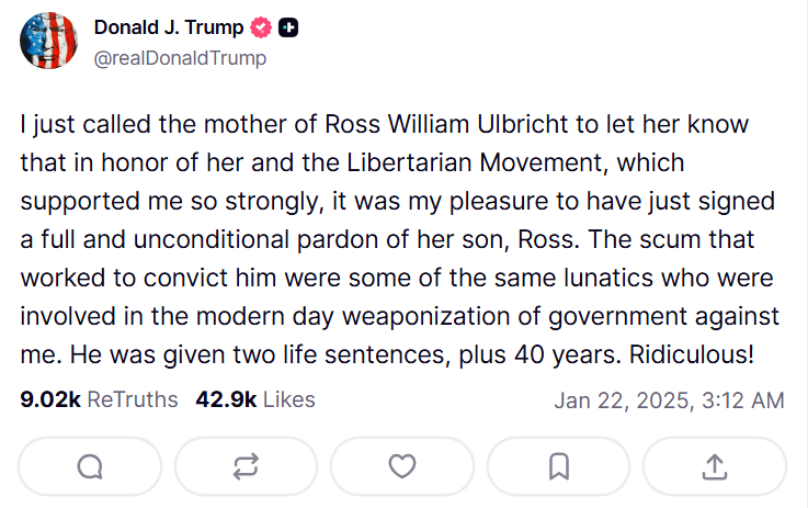 В январе 2025 года президент США Дональд Трамп объявил о полном и безусловном помиловании Росса Ульбрихта. Соответствующее заявление он разместил в социальной сети Truth Social.