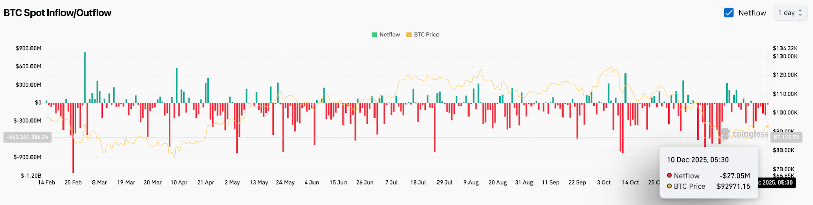 Потоки обмена остаются отрицательными. Данные Coinglass показывают примерно 27 миллионов долларов чистых оттоков на начало сегодняшней сессии. Отток товаров доминировал уже несколько недель, что подтверждает: предложение продолжает возвращаться на биржи, а не на долгосрочное хранение.