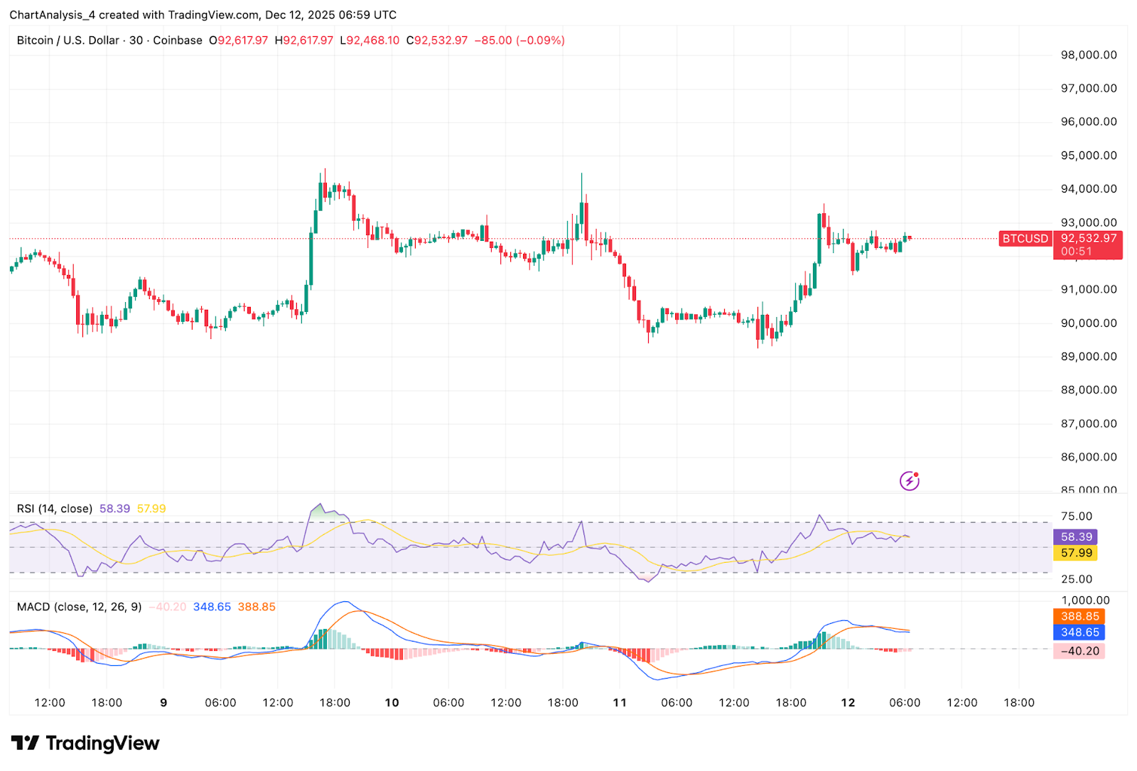 30-минутный график показывает лёгкую попытку восстановления после отката в среду. BTC вернул себе $92,500, но цена движется в сторону с слабым объёмом. RSI находится около 58, демонстрируя умеренный импульс, в то время как MACD остаётся выше линии сигнала, но снижается.