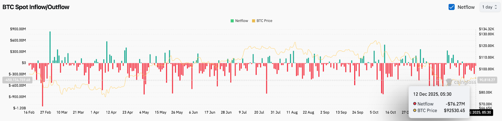 Это совпадает с спотовыми данными. Coinglass зафиксировала чистый отток в $76,27 млн 12 декабря, что стало ещё одним днём, когда ликвидность перешла с удержания кошельков и перешла в биржу. Постоянные красные полосы в недельных показаниях расходов свидетельствуют о предупреждении, а скачки притока с начала года не вернулись.